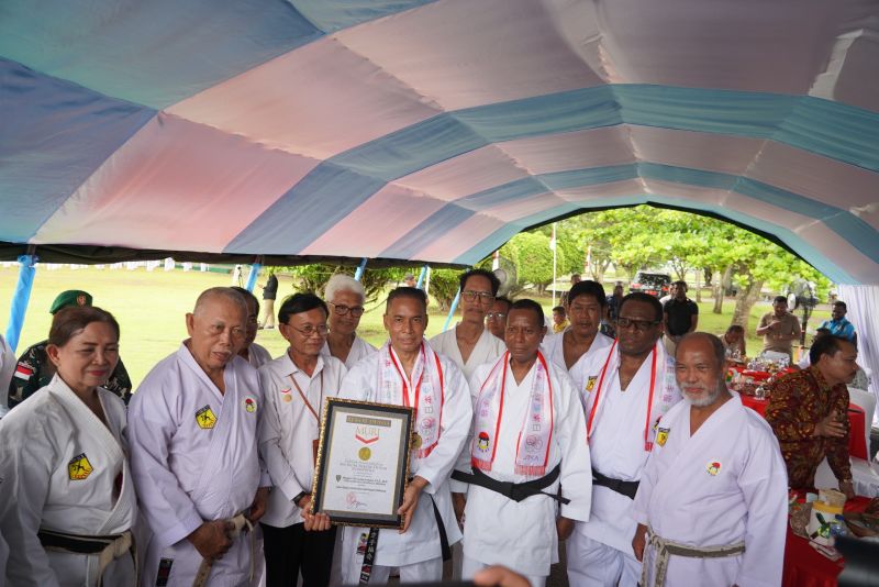Nusantaraterkini.co,MERAUKE-Pangdam XXIV/Mandala Trikora Mayjen TNI Lucky Avianto memimpin pengukuhan 1.683 prajurit sebagai pemegang Sabuk Hitam INKAI sekaligus mencatatkan rekor MURI (Museum Rekor Indonesia) sebagai Ujian Karate Sabuk Hitam dengan Peserta Prajurit Terbanyak. Kegiatan digelar di Lapangan Upacara Kodam XXIV/MT, Jl. Poros Tanah Miring, Merauke, Kamis (4/12/2025).