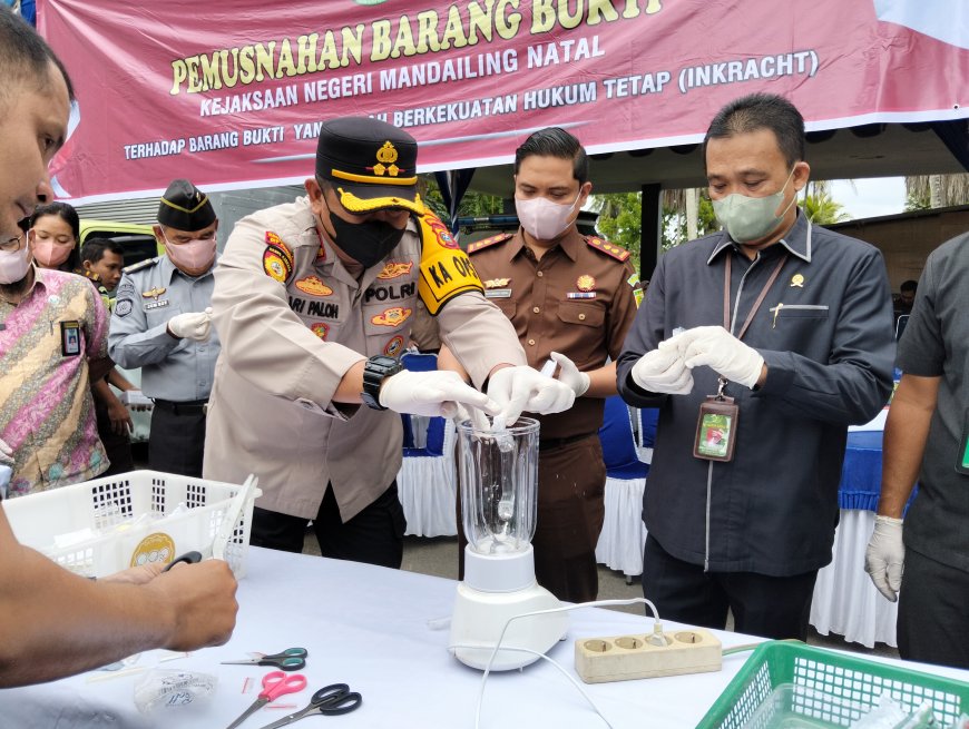 Pantauan wartawan, Kejari Madina melakukan pemusnahan barang bukti narkoba jenis ganja dengan cara dibakar dan untuk narkoba jenis shabu dengan cara penghancuran memakai blender.