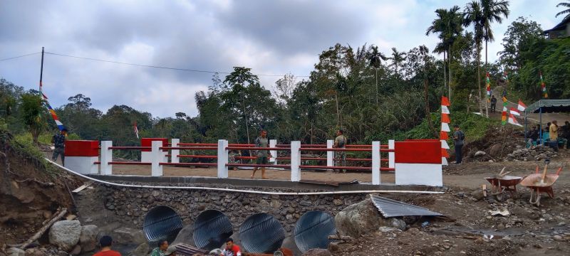 Untuk itu, TNI AD hadir membantu masyarakat membangun jembatan aramco. Terpantau jembatan yang memiliki bentangan sepanjang 12 meter dan lebar 3,5 meter dan dicat berwarna merah putih ini sudah bisa dilewati oleh masyarakat baik jalan kaki maupun menggunakan mobil.