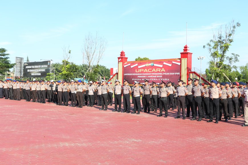 Nusantaraterkini.co, MEDAN - Mengawali Tahun 2025, sebanyak 1.510 personel Polda Sumatera Utara (Sumut) menerima kenaikan pangkat dalam upacara yang digelar di Lapangan KS Tubun, Mapolda Sumut, Kamis (2/1/2025).