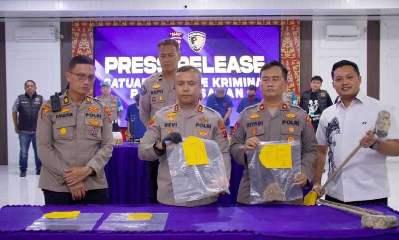 "Kita juga sudah mengamankan barang bukti dump truk, excavator, martil godam, pecahan batu. Tersangka dijerat Pasal 158 UU Minerba dan 359 KUHP, ancaman 5 tahun," tutup Revi.