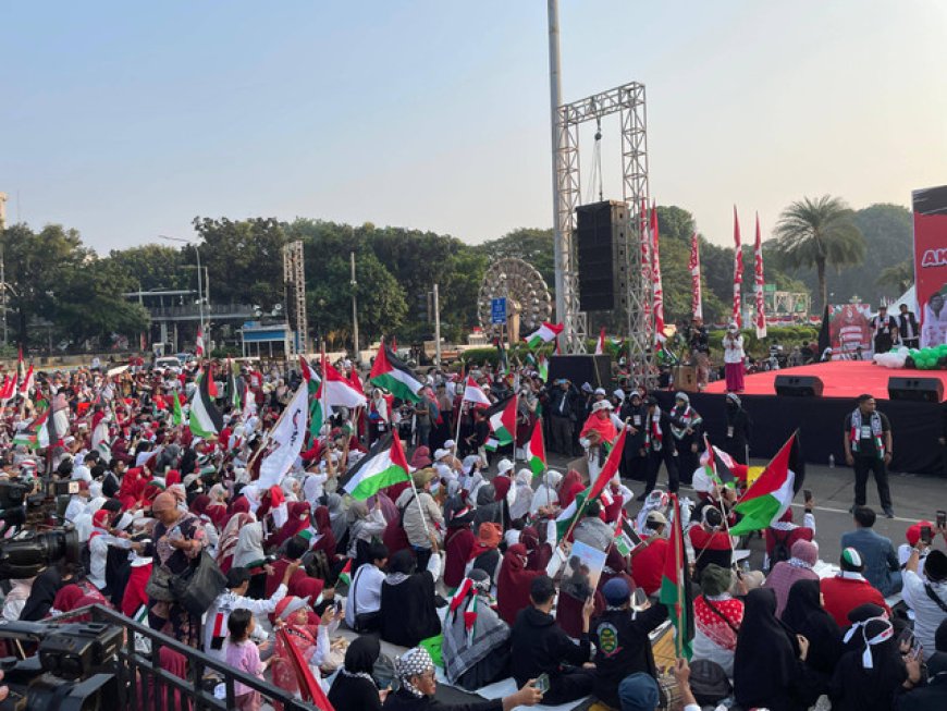 Mereka yang datang dengan pakaian merah-putih-hitam itu terlihat kompak mengibarkan bendera Palestina. Bersama dengan itu, massa juga mengibarkan bendera Indonesia.