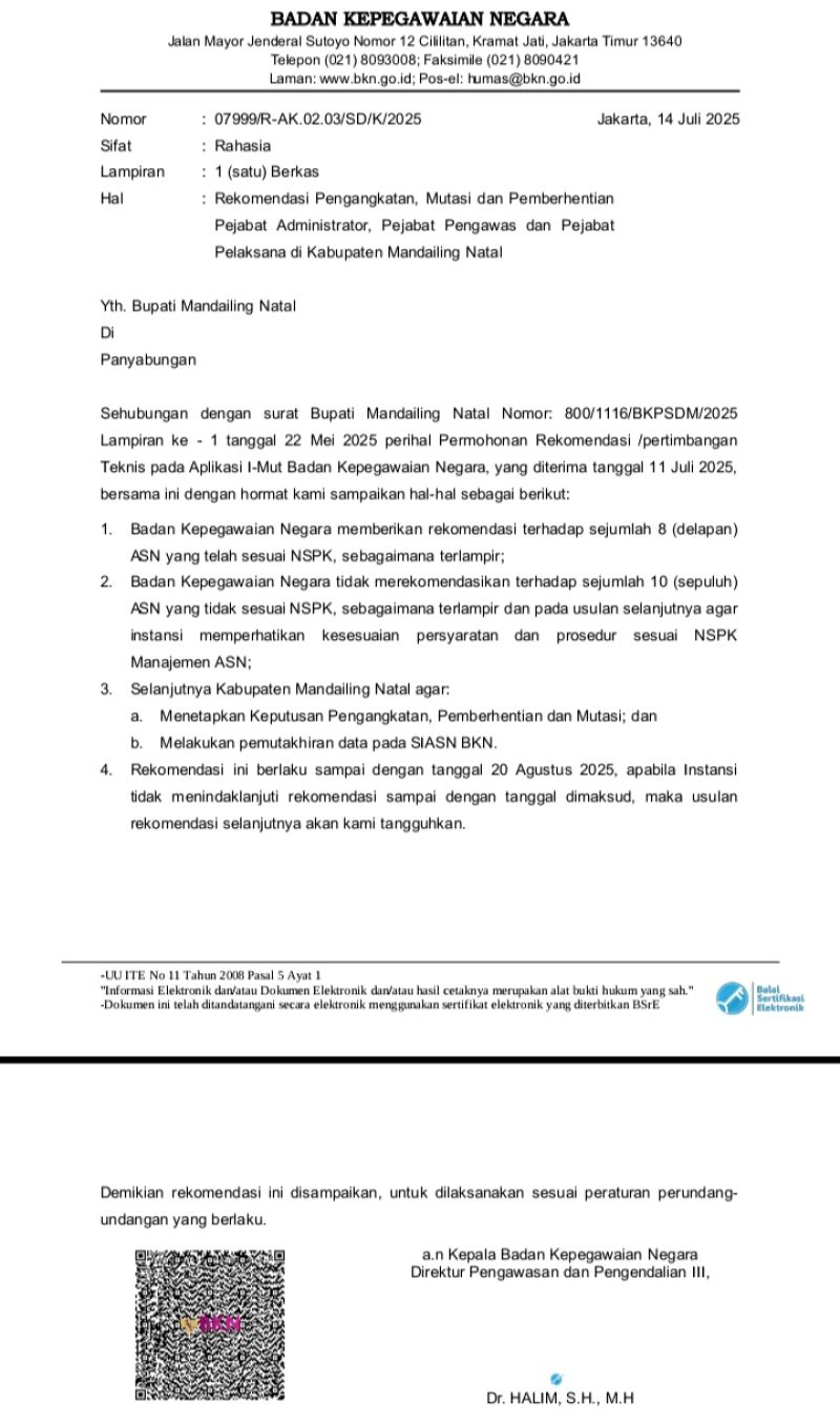 nusantaraterkini.co, MADINA - Badan Kepegawaian Negara mengeluarkan surat dengan nomor 07999/R-AK.02.03/SD/K/2025 terkait rekomendasi mutasi, pengangkatan, dan pemberhentian pejabat administrator untuk Kabupaten Mandailing Natal ( Madina).