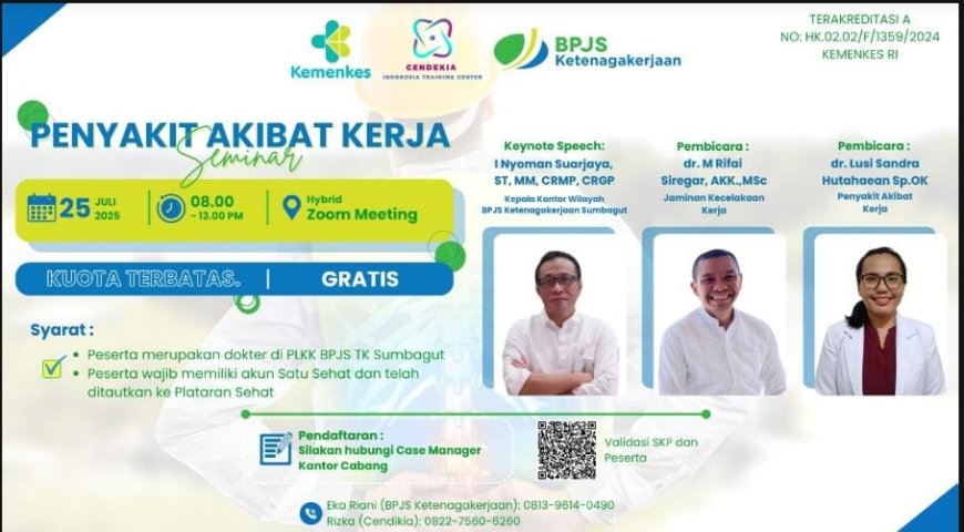 Nusantaraterkini.co, Medan - Badan Penyelenggara Jaminan Sosial (BPJS) Ketenagakerjaan Wilayah Sumatera Bagian Utara berkolaborasi dengan Kementerian Kesehatan dan PT Cendikia Training Center melaksanakan seminar Penyakit Akibat Kerja Kepada 400 peserta yang merupakan dokter dan tenaga medis di Pusat Layanan Kecelakaan Kerja yang diselenggarakan secara hybrid (daring dan luring) di Aula BPJS Ketenagakerjaan Sumbagut pada Jumat, (25/7/2025).