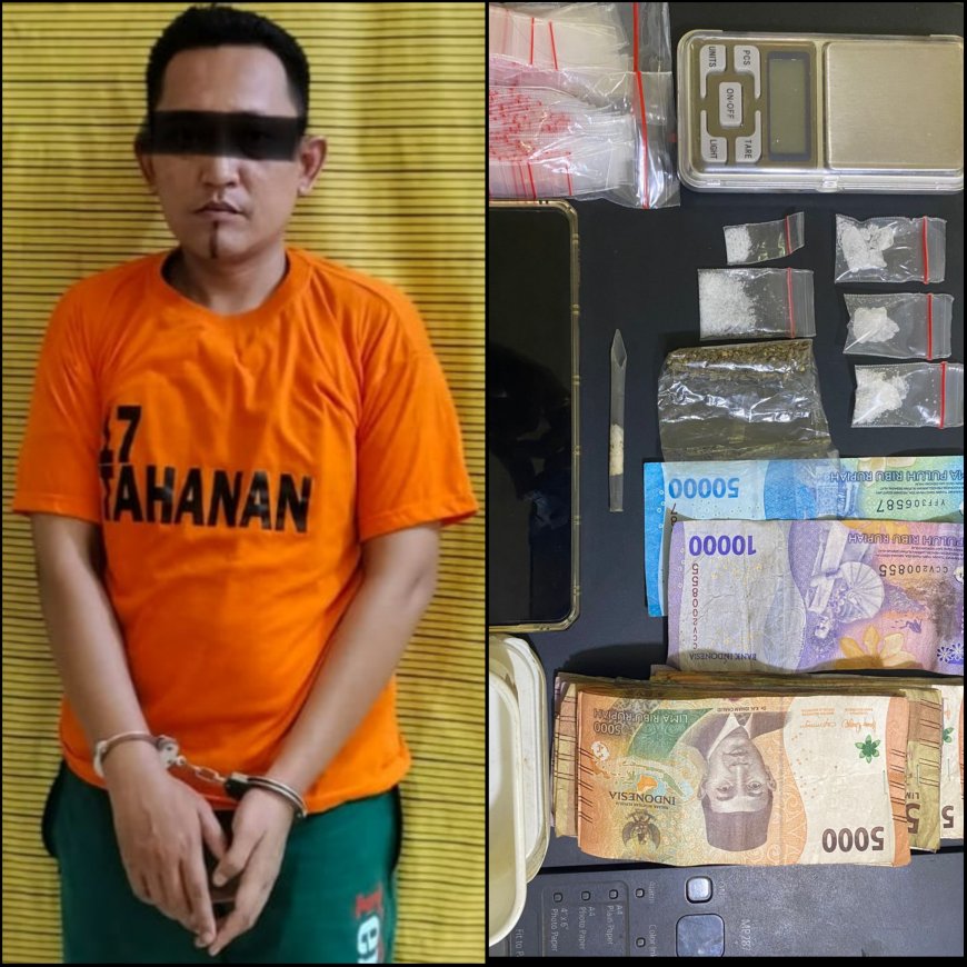Saat dilakukan penggrebekan, lanjut Syamsul, ditemukan barang bukti berupa lima paket diduga narkotika jenis sabu dengan berat brutto 4,64 gram dibungkus dengan plastik klip transparan, satu paket diduga daun ganja kering dengan berat bruto 1,20 gram di bungkus plastik transparan , dua bungkus plastik klip transparan, satu buah pipet skop, satu unit timbangan elektrik, satu unit HP merk Readmi, satu kotak plastik warna putih (tempat penyimpanan) serta uang tunai Rp. 360.000, (sebagai uang hasil penjualan pengakuan dari pelaku).