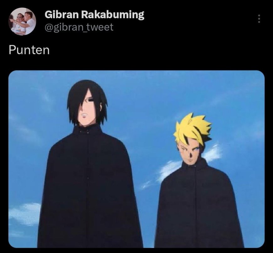 Nusantaraterkini.co, JAKARTA - Calon wakil presiden (cawapres) dengan nomor urut 2, Gibran Rakabuming, mengunggah foto tokoh anime Sasuke dan Boruto pada akun media sosial X (Twitter) miliknya.