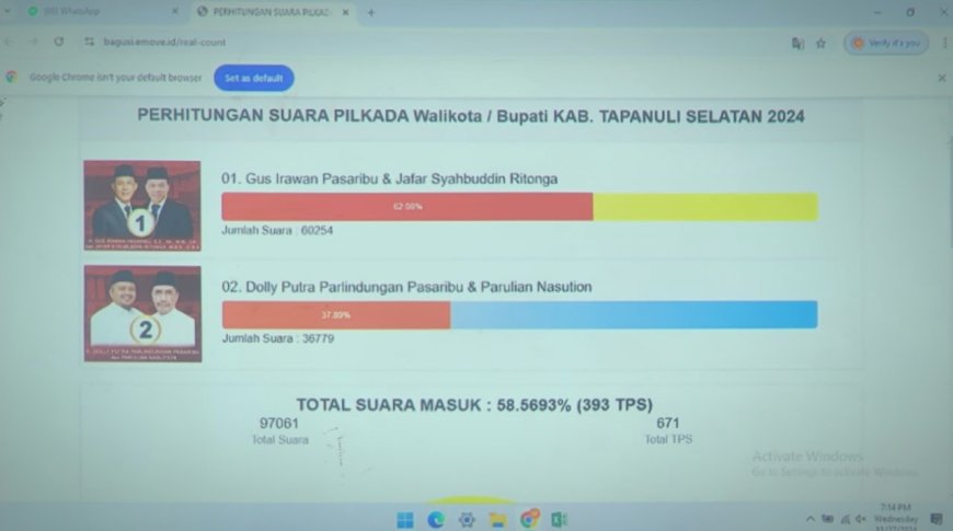 Irwansyah yang akrab disapa Ibey menyampaikan, dari data sementara real count yang sudah masuk, pasangan Gus Irawan - Jafar Syahbuddin Ritonga memperoleh 62 persen suara sedangkan Doli - Parulian 37 persen suara, dari data yang masuk sudah 65 persen dari keseluruhan TPS.