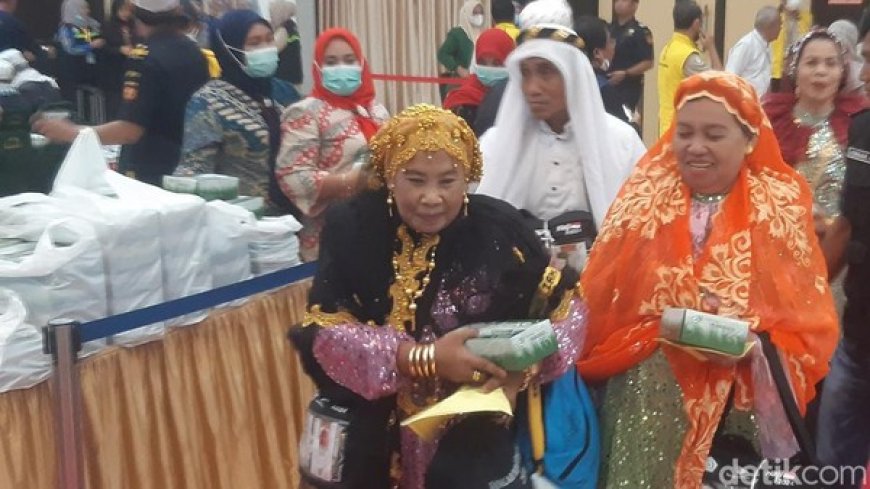 nusantaraterkini.co, JAKARTA - Sebanyak 450 jemaah haji kloter 1 Debarkasi Makassar tiba di Asrama Haji Sudiang, Makassar, Sulawesi Selatan. Mereka yang selesai menunaikan ibadah haji pulang dari Makkah mengenakan pakaian nyentrik dibalut dengan perhiasan emas.
