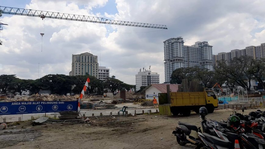 Dari luar, proyek tersebut masih dikelilingi oleh pagar seng, sehingga warga yang melintas tak bisa melihat secara langsung. Sementara, pada tampak dalam, terlihat, konstruksi bangunan pada bagian dalam belum berwujud, meski ada aktivitas pekerja, alat berat dan tumpukan tanah.