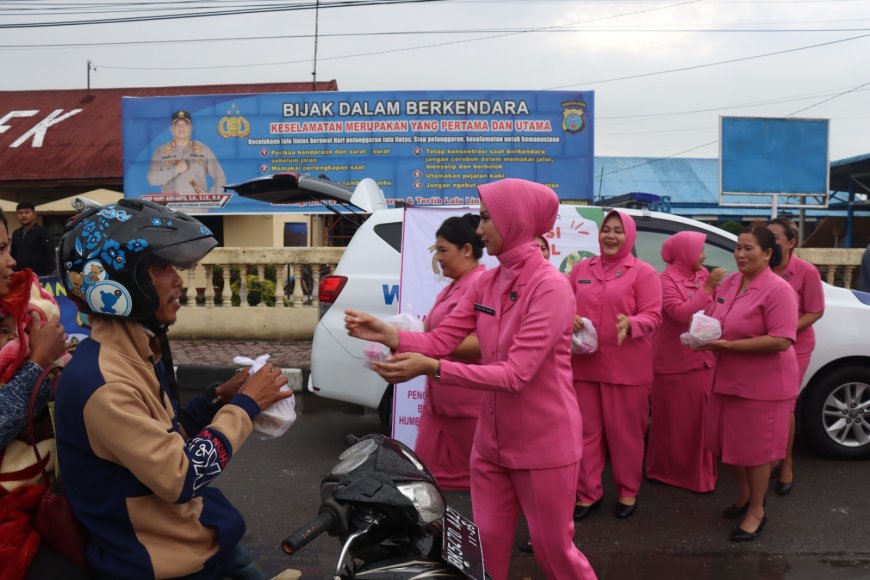 Pengurus Bhayangkari juga aktif membagikan takjil kepada masyarakat yang berlalu di sekitar wilayah tersebut.