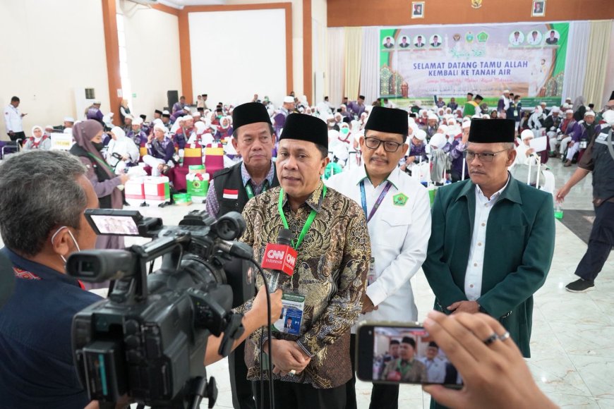 Nusantaraterkini.co, MEDAN - Ketua PPIH Debarkasi Medan Ahmad Qosbi dan Wakil Bupati Mandailing Natal Atika Azmi Utammi Nasution menyambut kedatangan jemaah haji Kelompok Terbang (Kloter) 5 di Aula 1 Madinatul Hujjaj Asrama Haji Medan, Selasa (17/6/2025).