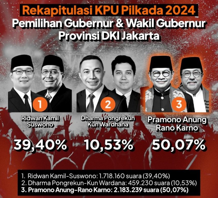 Pramono-Rano unggul dari Ridwan Kamil-Suswono yang meraih 1.718.160 suara atau 39,40% suara dan Dharma Pongrekun-Kun Wardana yang meraih 459.230 suara atau 10,53% suara.
