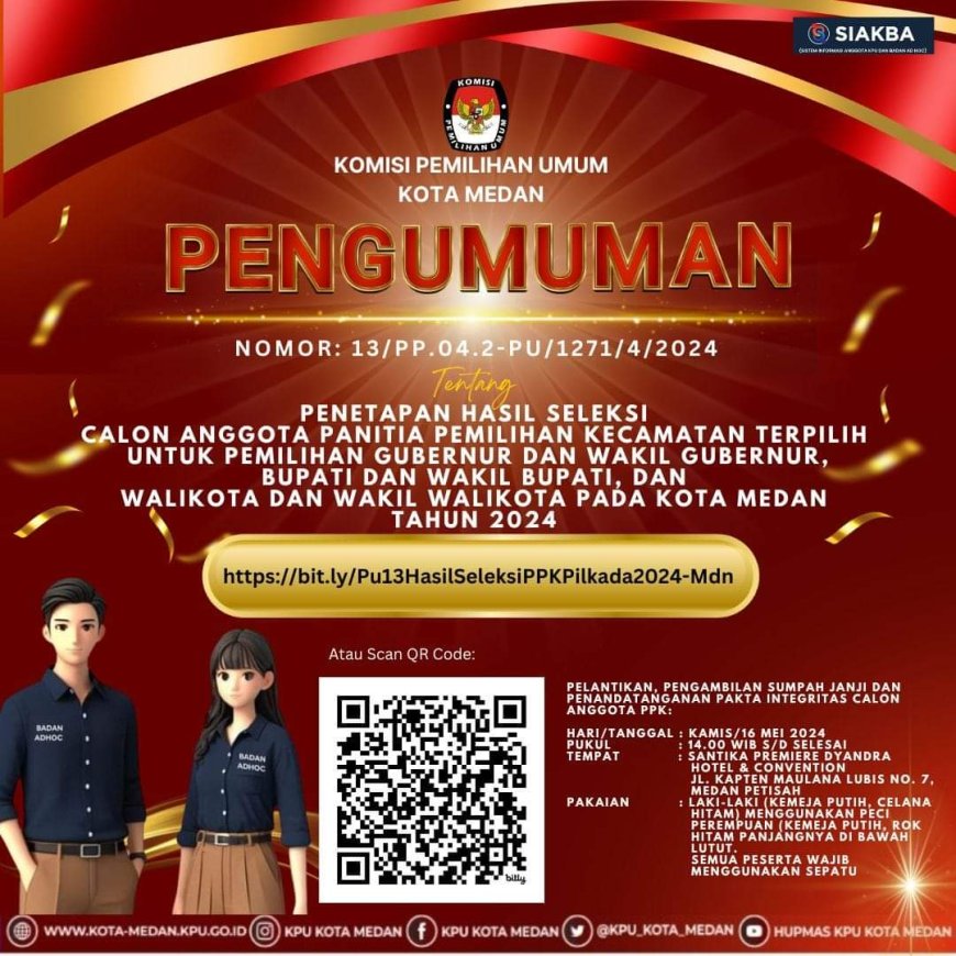 Untuk informasi lengkap nama-nama Panitia Pemilihan Kecamatan (PPK) Terpilih, Anda bisa langsung cek di media sosial resmi KPU Medan, baik akun Facebook maupun di Instagram. Anda bisa langsung download barcode yang tersedia pada flayer pengumuman yang ada. (fer/nusantaraterkini.co)