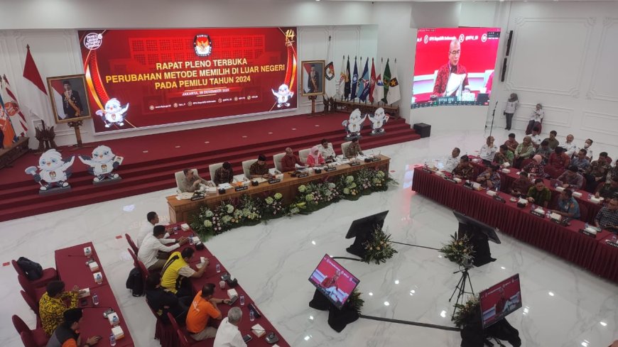 Hal ini disampaikan Ketua KPU Hasyim Asy'ari pada Rapat Pleno Terbuka Perubahan Metode Memilih di Luar Negeri pada Pemilu 2024 di Gedung KPU Pusat, Jakarta Pusat, Kamis (28/12/2023).