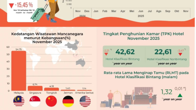 Meskipun secara agregat tahunan meningkat, tren bulanan menunjukkan adanya perlambatan pada November 2025. Jumlah kunjungan wisman pada bulan tersebut tercatat sebanyak 20.987 kunjungan, atau turun 15,45 persen dibandingkan Oktober 2025 yang mencapai 24.822 kunjungan.