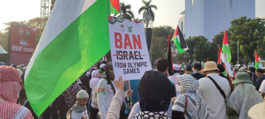 Aksi penolakan keikutsertaan Israel dalam ajang Olimpiade Paris yang digelar di Patung Kuda, Jakarta Pusat, pada Minggu (21/7). Foto: Rachmadi Rasyad/kumparan