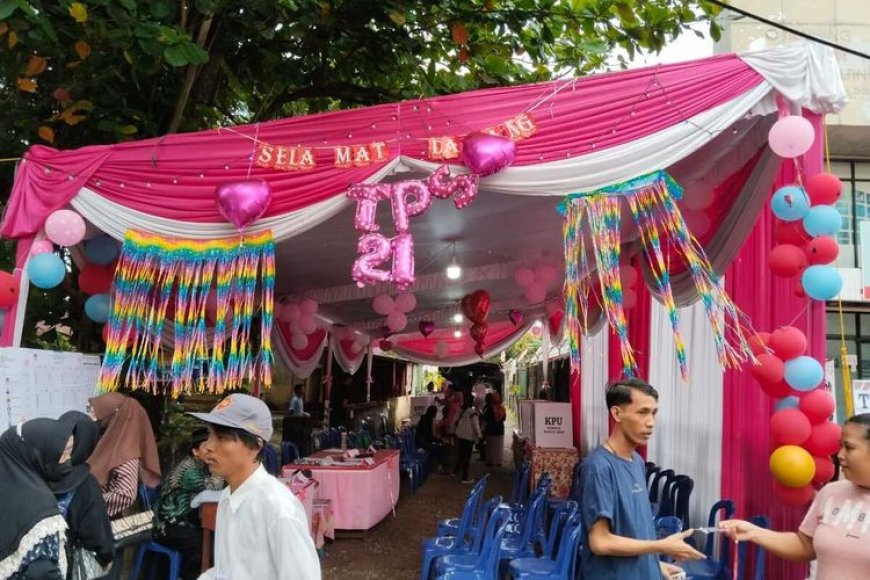 Suasana meriah ini pun begitu terasa di mana bagian luar tenda didekor bewarna pink disertai balon-balon untuk menarik warga berdatangan agar menyalurkan hak suaranya dalam pesta demokrasi.