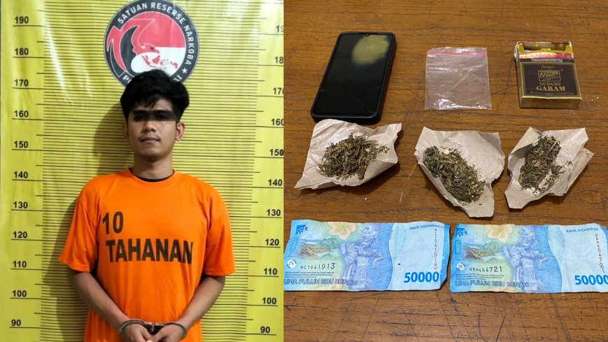 Saat mengamankan IF, personel berhasil menemukan barang bukti tiga paket narkoba jenis daun ganja seberat 9,35 gram di balut kertas warna cokelat dan dibungkus plastik klip transparan.