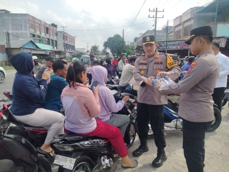 Tak hanya melakukan pengecekan, AKBP Bambang C. Utomo juga menyempatkan diri membagikan air mineral kepada para pengendara yang mengantre sejak pagi demi mendapatkan BBM.