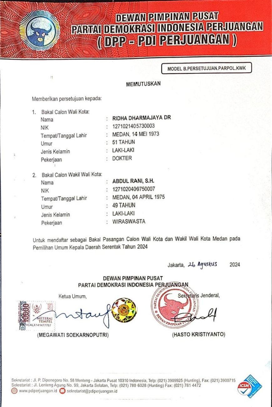 Nusantaraterkini.co, MEDAN - Dewan Pimpinan Pusat (DPP) PDI Perjuangan resmi memajukan Prof. DR. Ridha Dharmajaya dan Abdul Rani SH menjadi Calon Wali Kota dan Wakil Wali Kota Medan yang akan maju pada Pilkada Serentak 2024.