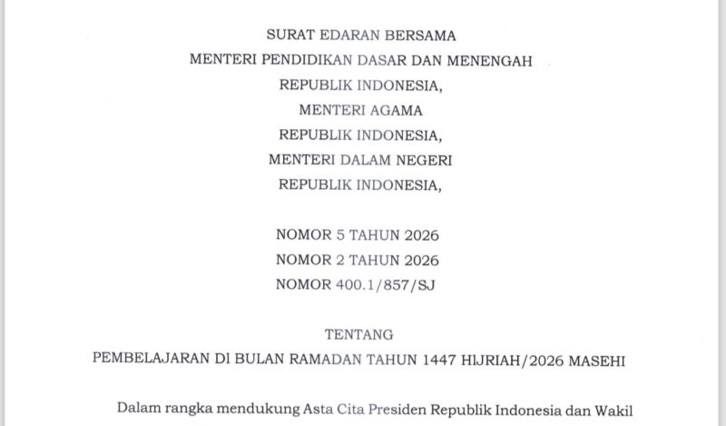 Nusantaraterkini.co, JAKARTA - Pemerintah melalui Kementerian Agama (Kemenag), Kementerian Pendidikan Dasar dan Menengah (Kemendikdasmen) serta Kementerian Dalam Negeri (Kemendagri) menerbitkan Surat Edaran Bersama (SEB) tentang Pembelajaran di Bulan Ramadan Tahun 1447 Hijriah/2026 Masehi.