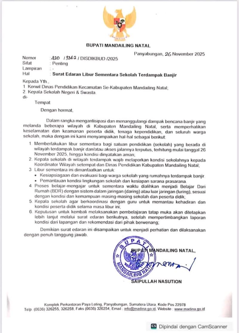 Dalam surat edaran yang diterima redaksi Rabu, (26/11/2025) malam, Bupati Mandailing Natal (Madina) Saipullah Nasution, menyampaikan 6 poin dalam rangka mengantisipasi dan menanggulangi danpak bencana banjir yang melanda beberapa wilayah di Kabupaten Mandailing Natal, serta memperhatikan keselamatan dan keamanan peserta didik, tenaga kependidikan, dan seluruh warga sekolah, maka dengan ini kami menyampaikan hal-hal sebagai berikut: