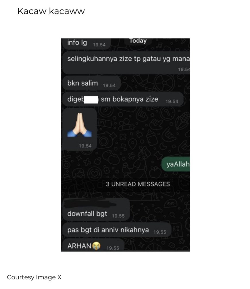 Netizen itu menambahkan, "Semua temannya ngumpul, termasuk Zize. Dan manager-manager juga ngumpul." Pemilik akun @megicallove mengaku mendapatkan tangkapan layar tersebut dari sebuah akun gosip di Instagram.