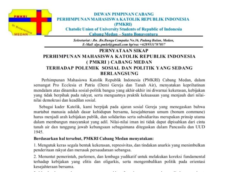 Nusantaraterkini.co,MEDAN - Perhimpunan Mahasiswa Katolik Republik Indonesia (PMKRI) Cabang Medan Santo Bonaventura, kembali menegaskan posisinya dalam dinamika sosial-politik nasional yang belakangan ini kian sarat dengan praktik kekerasan, represi aparat, dan kebijakan elitis-oligarkis yang abai terhadap kepentingan rakyat banyak.