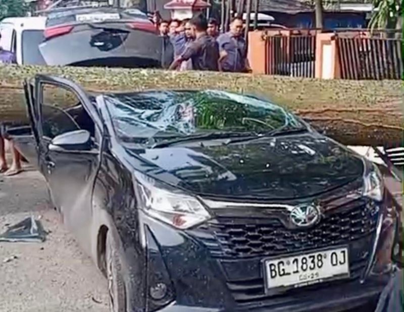 Insiden tersebut mengakibatkan tiga unit mobil yang sedang terparkir mengalami kerusakan signifikan akibat tertimpa material pohon.