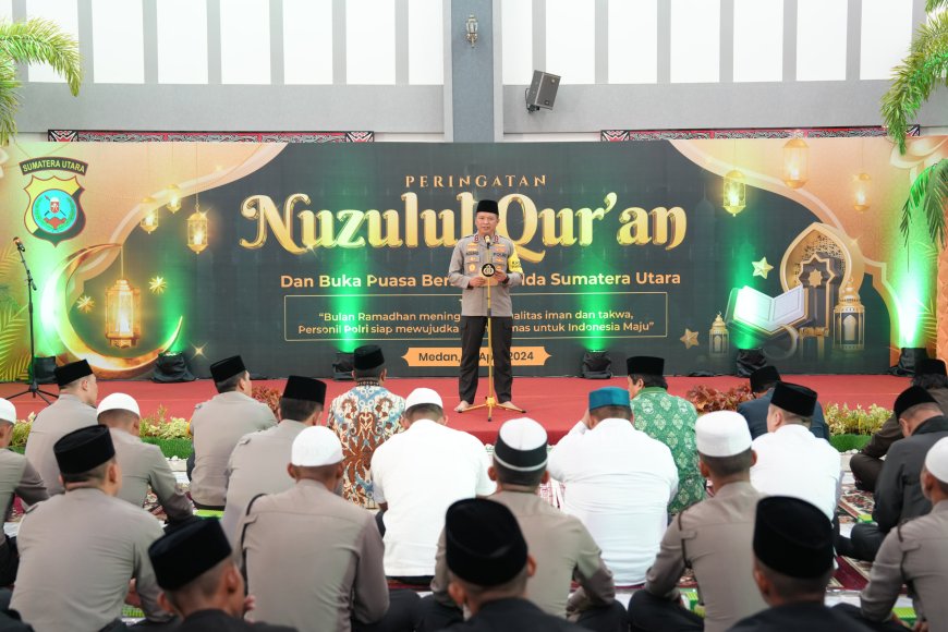 Nusantaraterkini.co, MEDAN - Polda Sumatera Utara (Sumut) menggelar peringatan Nuzulul Quran dan buka puasa bersama bertempat di Aula Tribarata Mapolda Sumut, Selasa (2/4/2024).