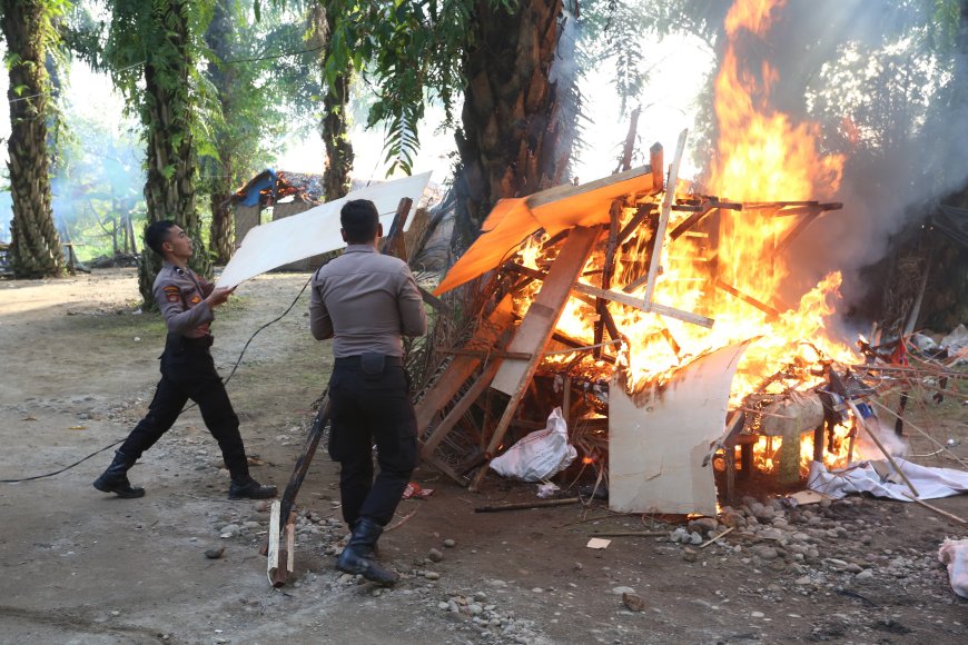 Selanjutnya petugas meratakan dengan membakar gubuk-gubuk yang diduga sebagai sarang peredaran narkoba serta tempat perjudian sebagai komitmen Polda Sumut dalam memberantas peredaran narkoba.