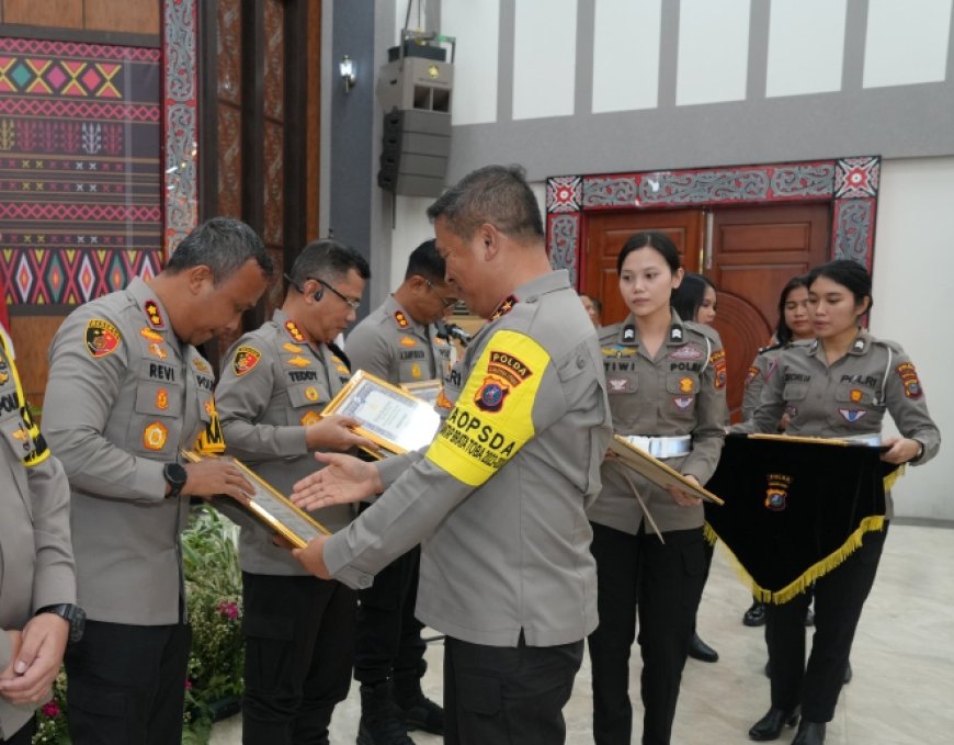 Piagam penghargaan diterima Kapolres Nias AKBP Revi Nurvelani yang diserahkan langsung oleh Kapolda Sumut didampingi Kabid Humas Kombes Pol Hadi Wahyudi di Aula Tribrata Polda Sumut, Selasa (8/5/2024)