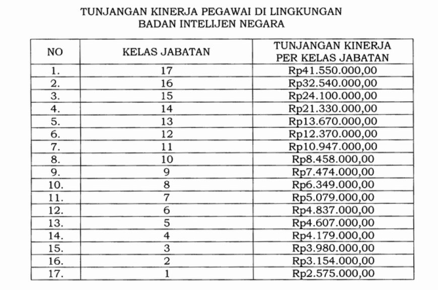 Bagi Kepala BIN diberikan tunjangan kinerja sebesar 150 persen dari tunjangan kinerja tertinggi di lingkungan BIN.