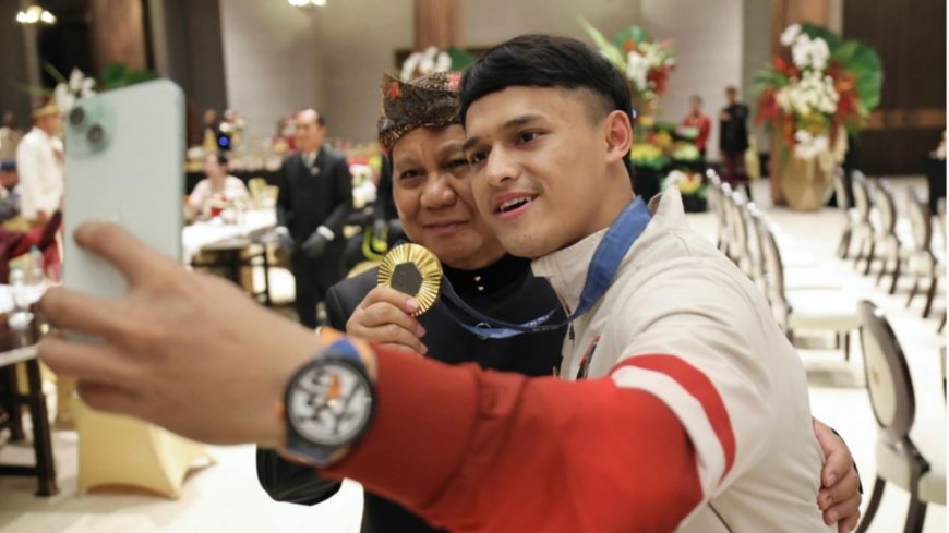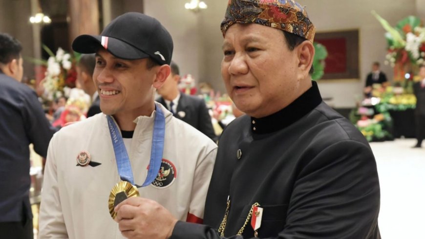 Nusantaraterkini.co, JAKARTA - Presiden terpilih Prabowo Subianto foto bareng dengan dua atlet peraih medali emasi di ajang Olimpiade Paris 2024. Dałam postingan di akun instagram pribadinya, Prabowo Subianto terlihat berfoto dengan Juniansyah dan Veddriq.
