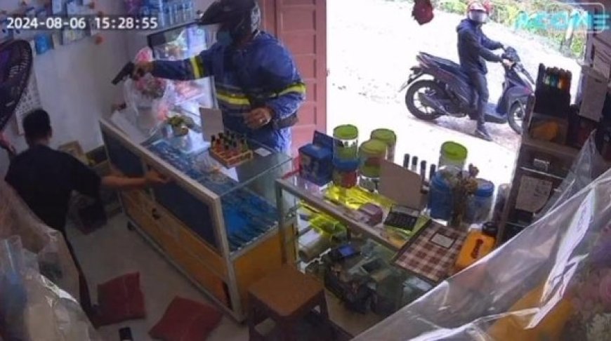 Dalan rekaman video CCTV yang dilihat pada Rabu (7/8/2024) dan sempat viral itu, terlihat seorang pria turun dari sepeda motor dan langsung masuk ke Kios Mini ATM sembari menodongkan senjata mirip senjata api kepada penjaga Kios.