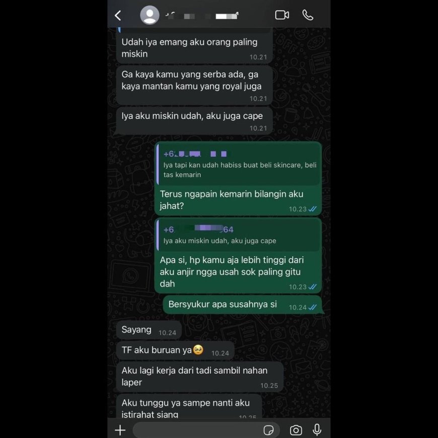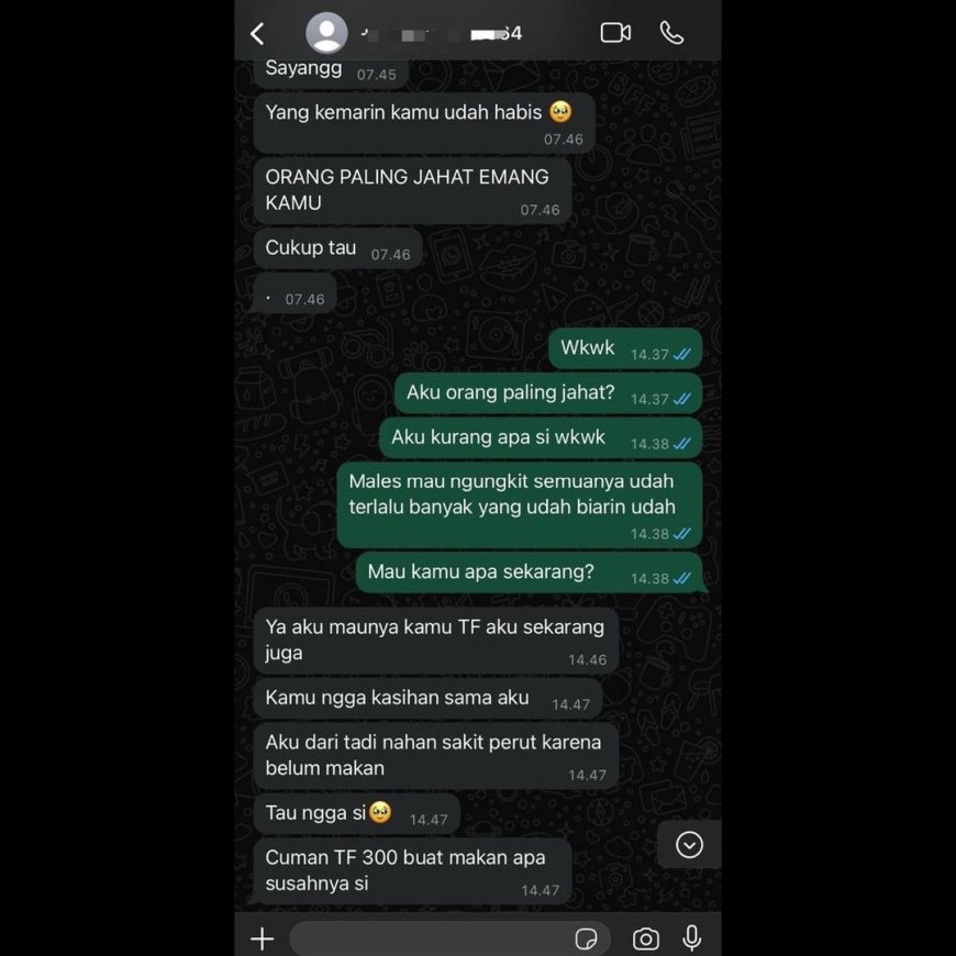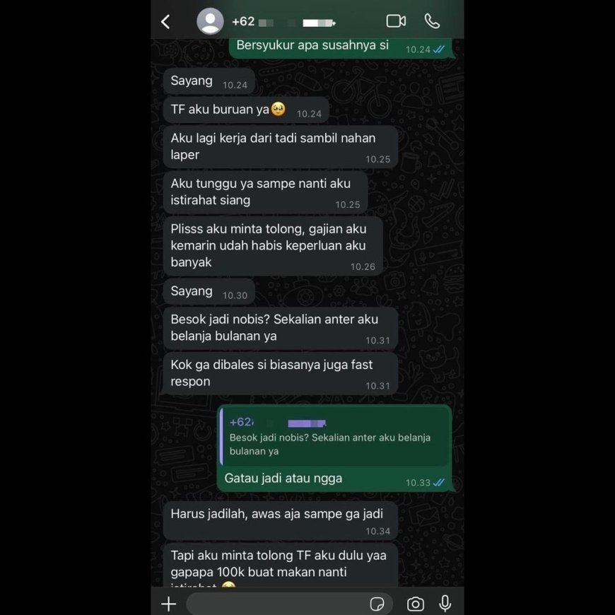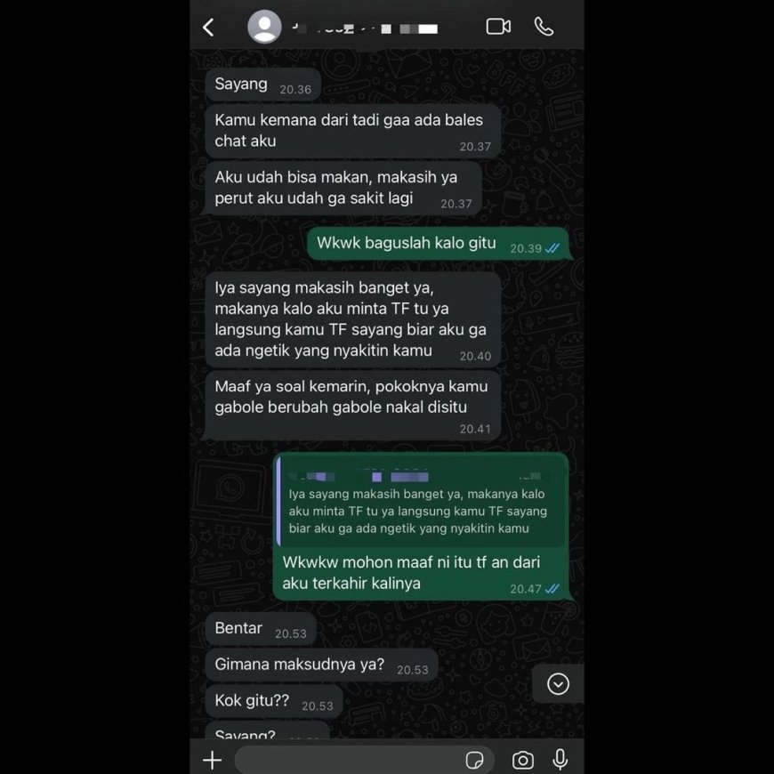 Mulai dari permintaan transfer duit agar bisa makan siang dan begitu transfernya lama dilakukan sang pria, si cewek langsung bilang dengan alasan perutku sakit sampai kepada balas chat dengan omongan yang tidak seharusnya.