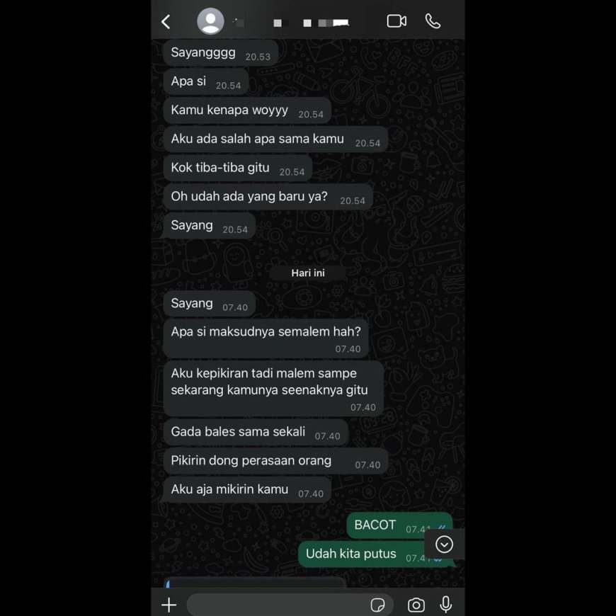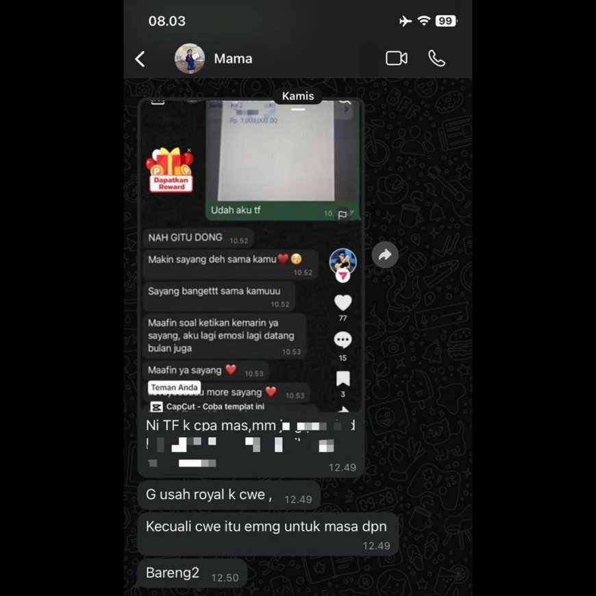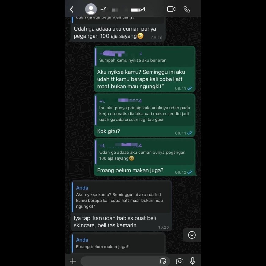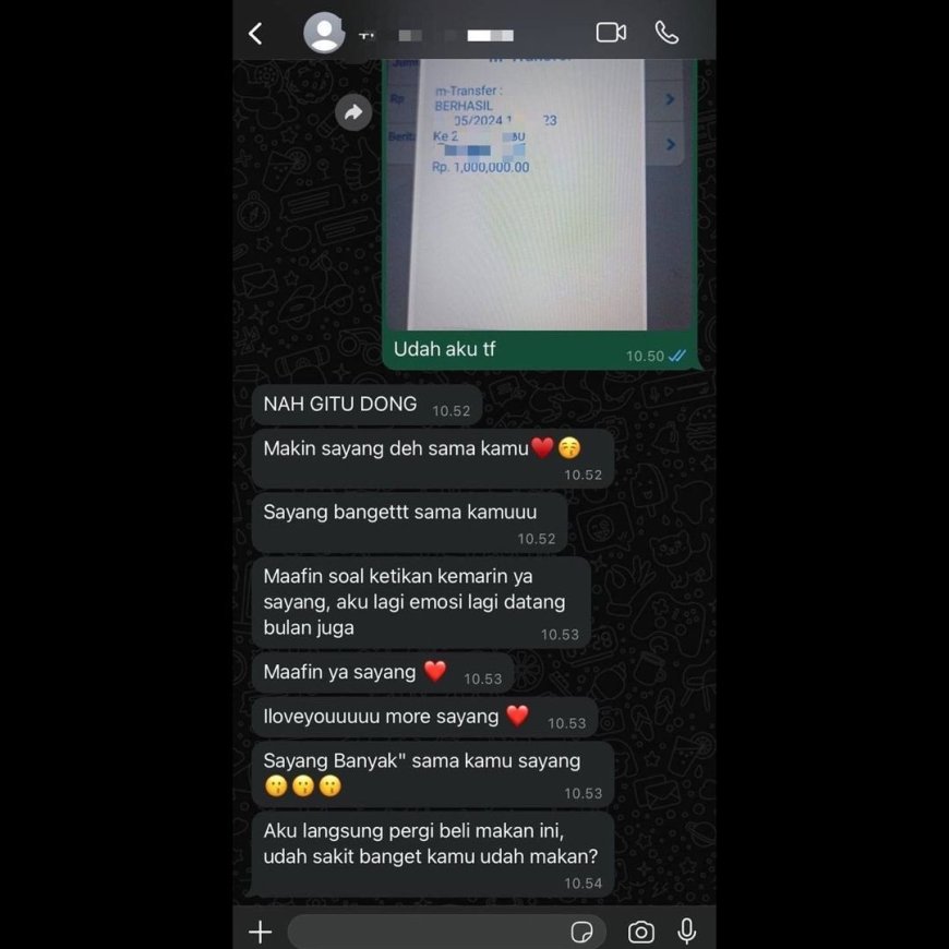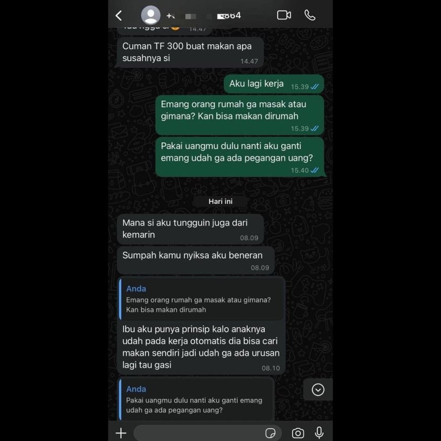 Mulai dari permintaan transfer duit agar bisa makan siang dan begitu transfernya lama dilakukan sang pria, si cewek langsung bilang dengan alasan perutku sakit sampai kepada balas chat dengan omongan yang tidak seharusnya.