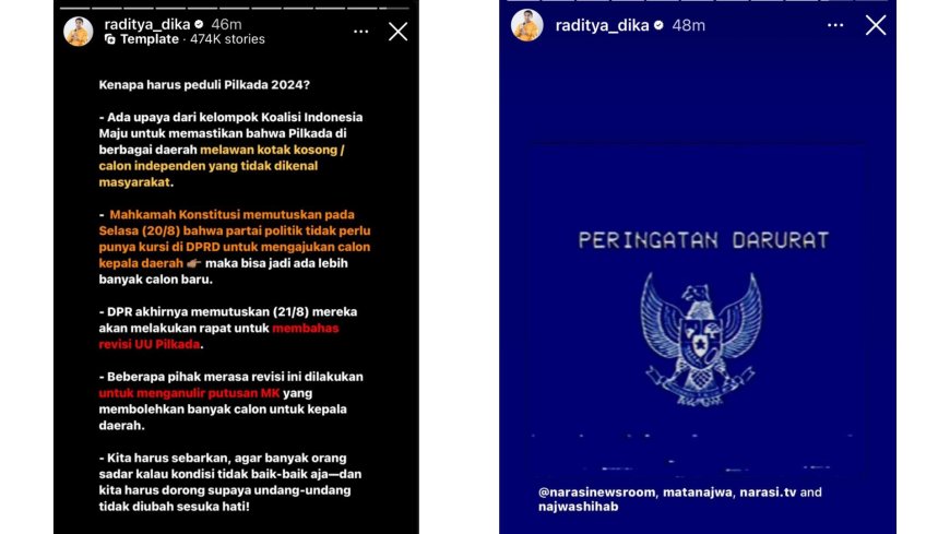 Di mana dalam postingan tersebut, @JS_Khairen menampilkan dua gambar di mana gambar satunya lambang Garuda biru dengan tulisan ‘Peringatan Darurat’ dan yang satu lagi potongan gambar dari status whatsapp sang komika terkenal Raditya Dika.