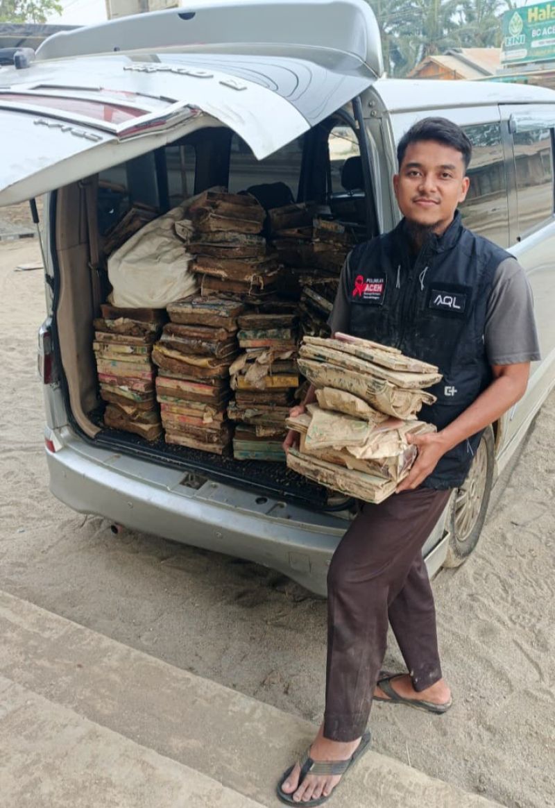 “Jumlah Al Qur’an rusak yang kami kumpulkan di tiga masjid sekitar 350 eksemplar. Kondisinya berlumpur, kertas sudah menyatu, lengket dan hampir rata-rata gembung akibat terendam air serta lumpur,” tuturnya.