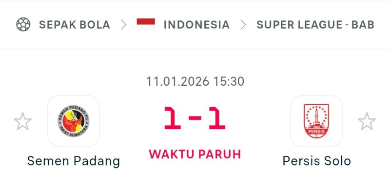 Nusantaraterkini.co, PADANG-Pertandingan pekan lanjutan Liga Super Indonesia antara Semen Padang melawan Persis Solo, Minggu (11/1/2026), menyuguhkan drama luar biasa sejak peluit pertama dibunyikan. Laga yang berlangsung di bawah guyuran tensi tinggi ini menutup babak pertama dengan skor sama kuat 1-1, namun di balik angka tersebut tersimpan rangkaian kejadian dramatis yang jarang terjadi di lapangan hijau.