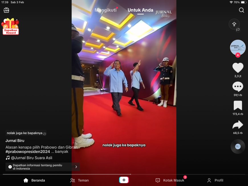 Dalam postingan tersebut ditampilkan video Prabowo Subianto yang datang di saat Jokowi menjadi Presiden RI ke-7. “Gue enggak dibayar sama sekali, gue coba kasih sudut pandang gue,” dalam postingan akun tiktok Jurnal Biru. Ada dua fenomena yang harus kalian ketahui, kawan.