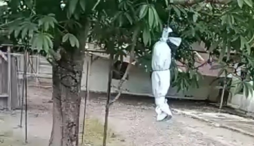 Warga setempat yang melihat peristiwa itu langsung menurunkan spanduk yang dibentuk mirip pocong itu dari atas pohon yang di gantung menggunakan tali.