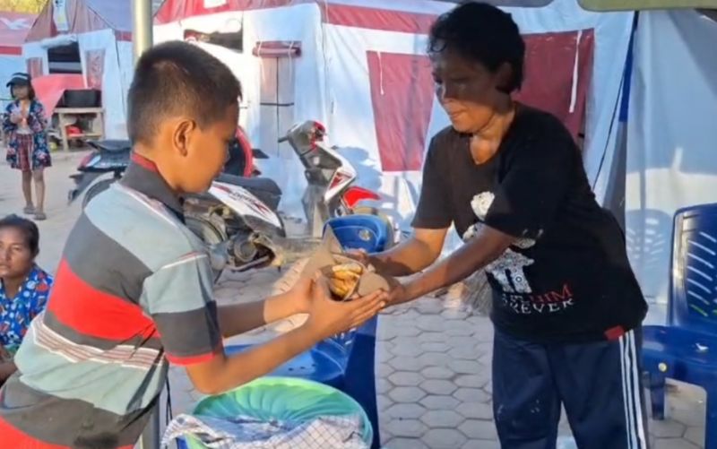 Retnawati rela berjuang dan berjualan untuk menormalkan kembali ekonomi keluarga mereka pasca sudah satu bulan dia berjualan di posko pengungsian.
