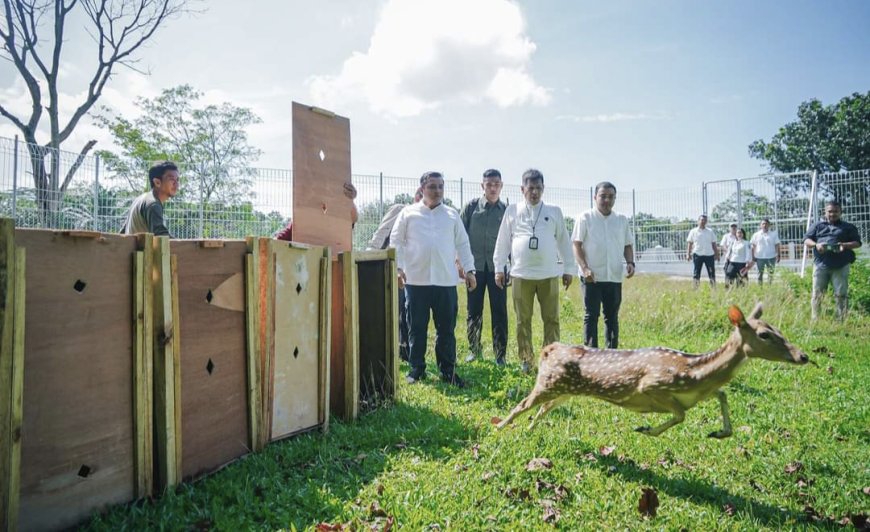 Pj Sekda Kota Medan Topan Obaja Putra Ginting melepas 15 ekor rusa di Taman Cadika, Rabu (9/10/2024). Dimana, 3 ekor di antaranya jantan dan 12 ekor betina. Pelepasan dihadiri pihak Istana Kepresidenan Bogor, Abdul Gani Hamumuroafa dan Kadis Pemuda dan Olahraga Kota Medan T Chairuniza.