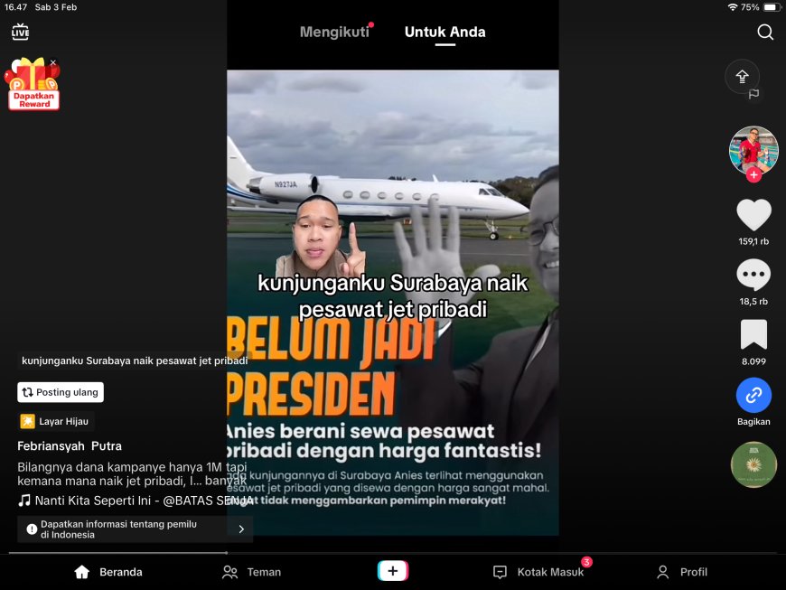 Nusantaraterkini.co, JAKARTA - Viral dana kampanye Anies hanya Rp 1 Miliar namun ke mana-mana naik jet pribadi. Seperti yang diunggah dari tiktok milik Febriansyah Putra. Dalam postingan tersebut dibahas tentang pasangan calon nomor urut 1 dana kampanye hanya Rp 1 Miliar, banyak patungan dan inilah gerakan rakyat.