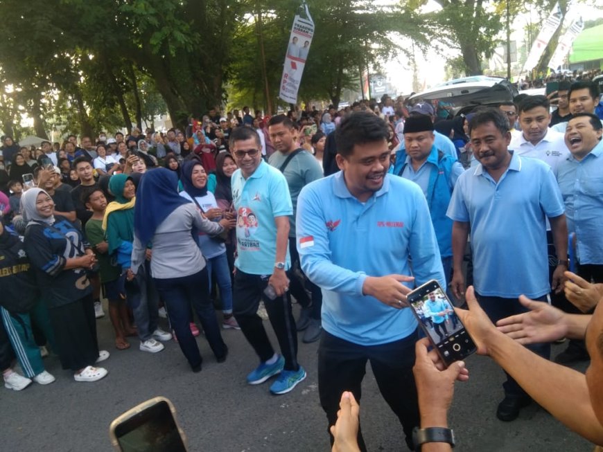 Nusantaraterkini.co, BINJAI - Walikota Medan Bobby Nasution dan Walikota Binjai Amir Hamzah, turut meramaikan jalan santai bersama relawan dan kaum millenial Prabowo - Gibran.